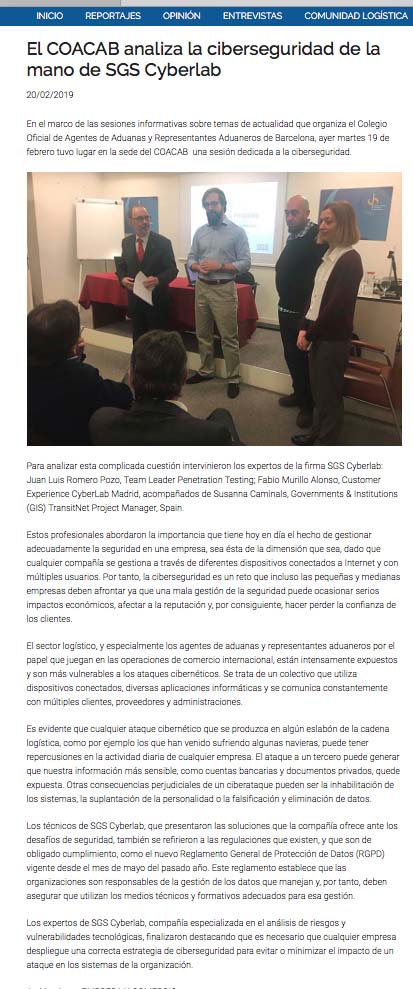 19/02/2019 - El COACAB analiza la ciberseguridad de la mano de SGS Cyberlab (GC)