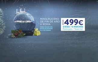 La oferta incluye: 6 días / 5 noches: 2 de navegación y 3 atracado en Civitavecchia, puerto de Roma, a modo de hotel flotante; cena de Fin de Año (buffet) con uvas, brindis y Fiesta de Nochevieja a bordo incluidas; pensión completa durante la navegación y todos los desayunos; 3 días para visitar Roma y alrededores (se puede hacer por libre o bien contratar traslados o traslados con visitas guiadas) y animación todas las noches. Además, hay la posibilidad de embarcar el coche o la moto y de viajar con mascotas.